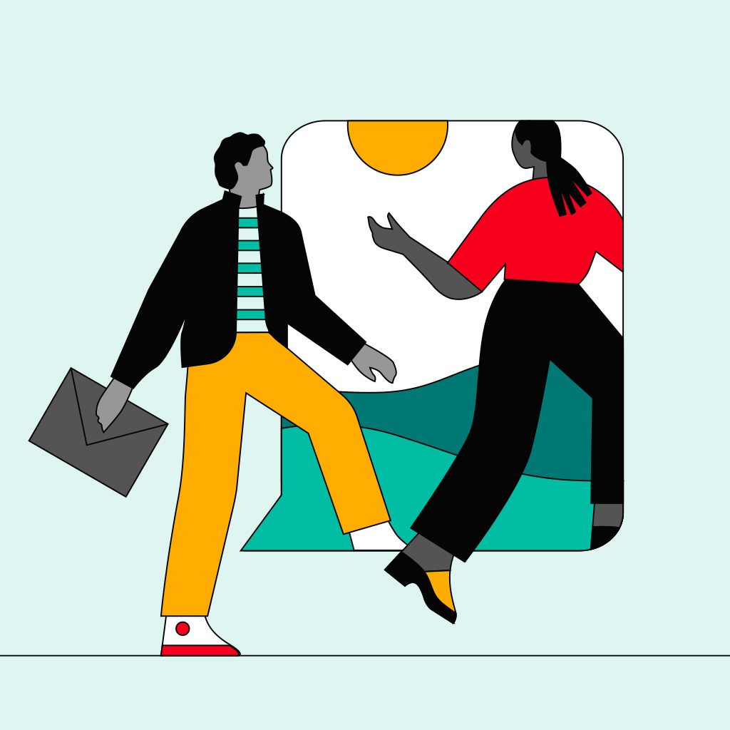 Illustration of two people sitting across from each other at a table. The person on the left wears a green shirt, gray pants, and yellow shoes, holding a white cup. The person on the right wears a white shirt, red pants, and black shoes, holding a red cup.